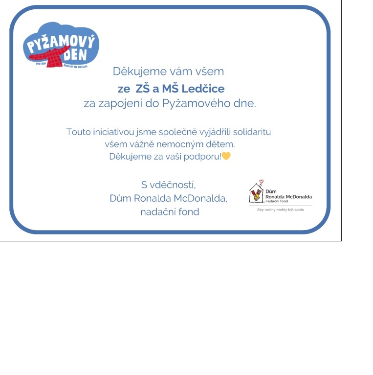 Ve škole jsme prožili výjimečný pyžamový den. Obléknutím pyžama jsme vyjádřili solidaritu s vážně nemocnými dětmi a jejich rodinami. Celý den jsme se neučili – místo toho panovala pohodová atmosféra v pyžamech a čekal nás program plný zábavy. Po škole byla připravena stanoviště s různými úkoly, od sportovních po kreativní. Odpoledne program pokračoval i ve družině dalšími aktivitami. Byl to den plný smíchu, spolupráce a dobrého pocitu z toho, že můžeme společně pomáhat.